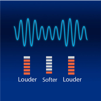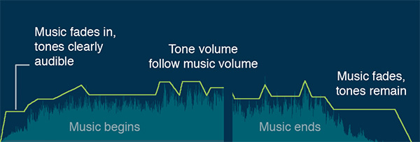 In the beginning, as the music is fading in, the tones plateau above the level of the music so as to be clearly audible, after which they begin to follow the music more closely. At the end, as the music fades, the tones remain audible, as a kind of reference, before fading away with the music.
