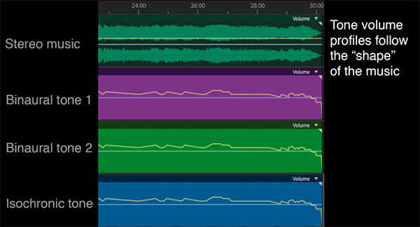 The volume of the tones, shown by the wavering line in the colored tracks, is calibrated to follow every nuance of the volume of the music, keeping the tones always just in the audible range. Note how the shape of the volume profiles is the same as the shape of the sound waves in the stereo music track, but not always exactly. Some instruments and some frequencies sound louder at a given volume than others, and that is one of the factors in our sound adjustments. This was not an automated process; pitch, tonal quality, and other aspects of the music as well as the sound qualities of the beats and tones themselves were factors in adjusting volume, and together the Gordons and SongRest went through many rounds of edits to get them just right.